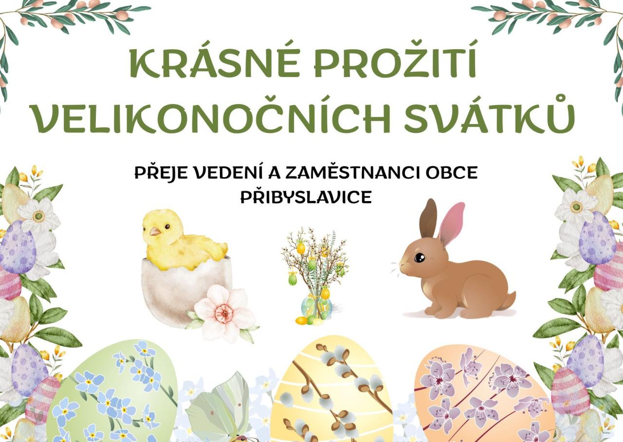 Vedení a zaměstnanci obce Přibyslavice přejí všem občanům krásné prožití velikonočních svátků. Doufáme, že tyto dny přinesou radost a pohodu do vašich domovů.